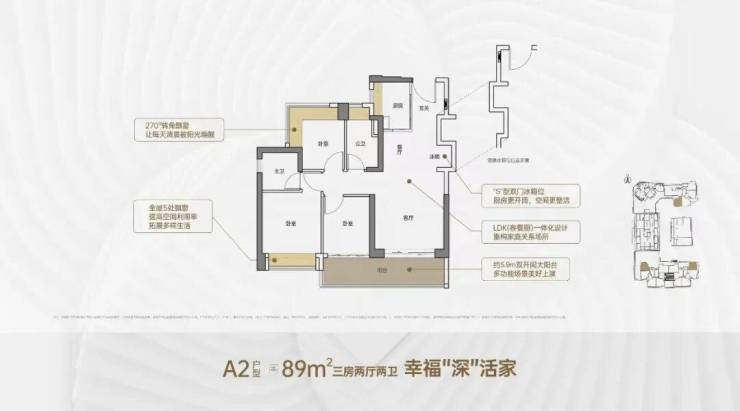 89㎡的3房2厅2卫,A2户型,设计的是竖厅格局,客厅3.5米开间,LDKB一体化,S墙设计预留冰箱卡槽位,客厅连接次卧出5.9米长的大阳台,次卧270度转角飘窗,U型厨房,卫生间干湿分离,阳台有朝西向、东向、南向。