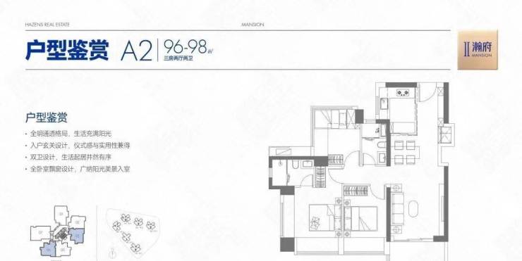 96-98㎡的3房2厅2卫,A2户型/2栋2单元03/06,设计的是经典竖厅格局,客厅3.5米开间,LDKB一体化,S墙设计预留冰箱卡槽位,动静分区,三开间朝南,主卧+1个次卧双飘窗,得房率约78%(不含赠送),U型厨房,卫生间干湿分离,西南或东南朝向。