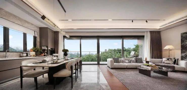 此外,公区也极为强调这种开阔感,客厅、餐厅、阳台、中西厨房一体化 ,共同构建了一个超级社交中心,会客、观影、聚餐、开party......