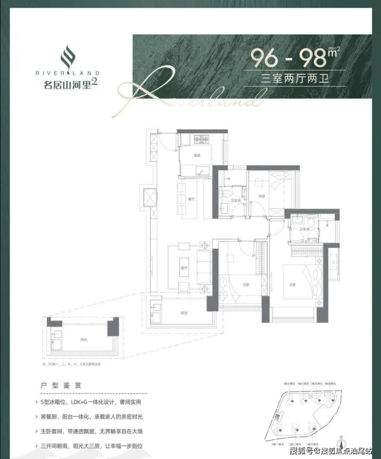 96-98平3房2厅2卫:东南朝向,不含赠送使用率在74%