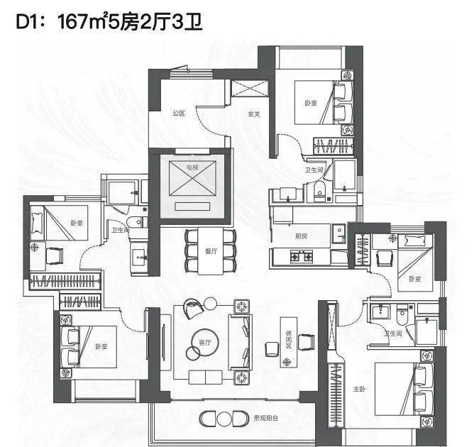 167㎡五房:总价1347万起,南北通透+双主卧套间,但厨房无生活阳台,精装品牌未公示。