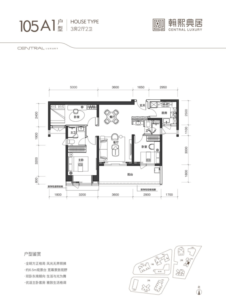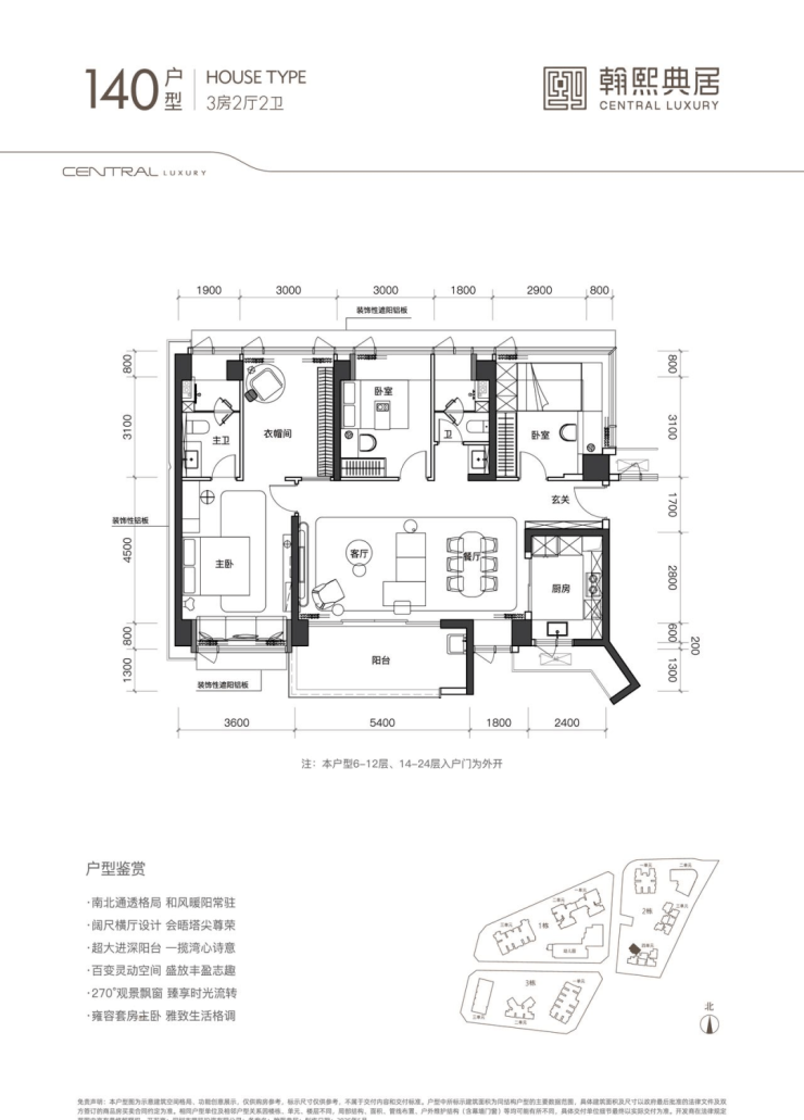 该户型为 02 地块的唯一一条腿,非常稀缺。户型南北通透,带大主卧套房的奢居型三房。带 5.4m 观景台,大横厅奢阔空间设计,主卧同客厅阳台、餐厅三面宽朝西南。北向双次卧、双卫生间、拓展空间共五面宽一字排开,视野全面俯瞰社区内园林,静谧舒适。