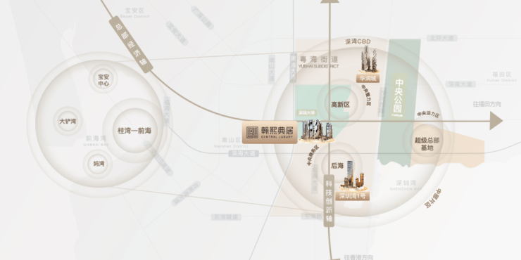 翰熙典居占位深圳经济命脉滨海大道与南北科创主轴南海大道交汇处十字轴心。集萃城市区位、科创、人文、TOD四大中心源点。依托两大科技园、四大总部基地,集总部经济+全球科创中心价值,坐享区域发展利好。