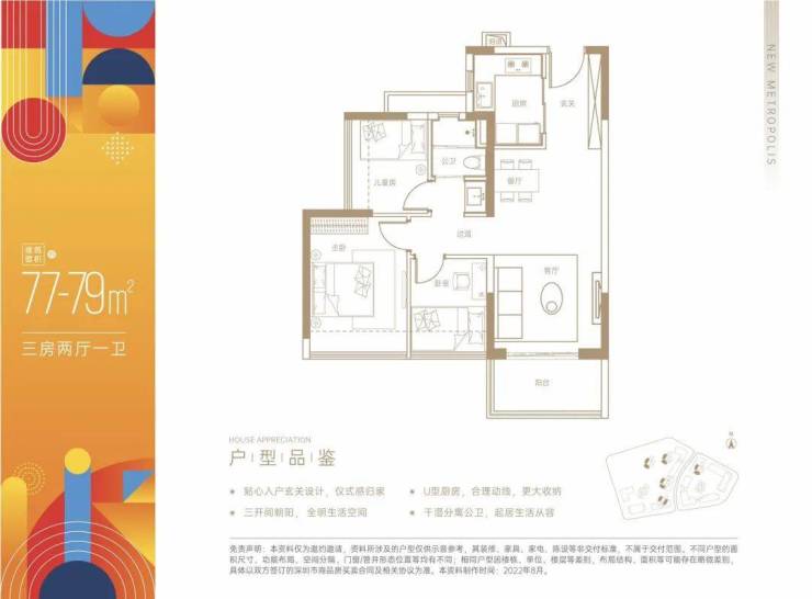 建面约77~79㎡三房两厅一卫