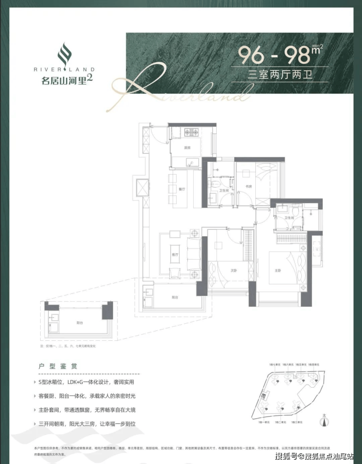 96-98平3房2厅2卫:东南朝向,不含赠送使用率在74%