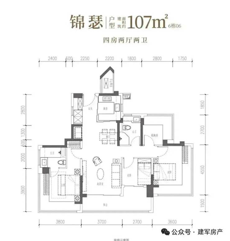 107㎡的4房2厅2卫,设计的是竖厅双龙抱珠格局,客厅3.7米开间,LDKB一体化设计,预留冰箱卡槽位,四开间朝南,主卧+2个次卧270°无柱转角飘窗,分别做到了主卧17.94㎡/次卧16.38㎡/次卧7.56㎡/次卧6.89㎡(包含墙体飘窗),U型厨房烟道外置,卫生间干湿分离,得房率约104.06%(包含赠送),客厅连接次卧出超大阳台约11.76平,东北朝向。