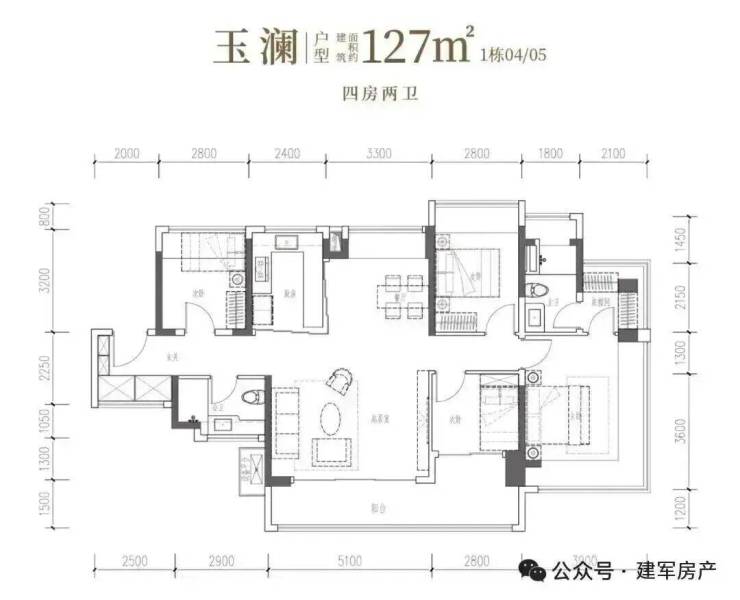 127㎡的4房2厅2卫,设计的是竖厅南北通透格局,进门独立玄关,客厅5.1米开间,客餐厅分离化设计,主卧270°无柱转角飘窗+衣帽间,分别做到了主卧18.55㎡/次卧11.2㎡/次卧8.96㎡/次卧7.84㎡(包含墙体飘窗),U型厨房烟道外置,卫生间干湿分离,得房率约98.97%(包含赠送),客厅连接次卧出超大阳台约14.09平,西南或东南朝向。