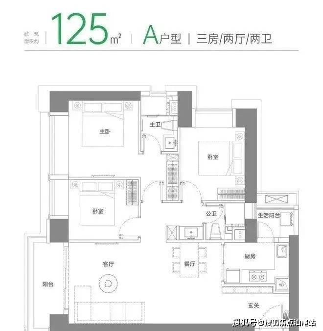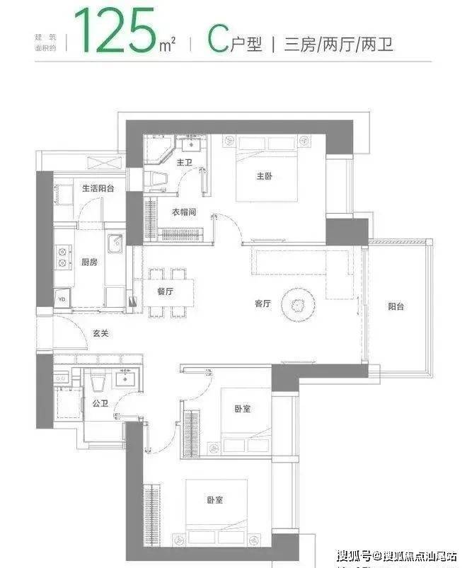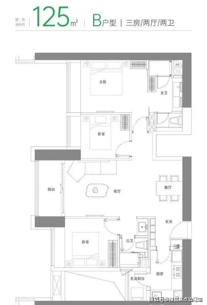③ 125㎡3房2卫:809套(A户型646套+B户型99套+C户型64套)