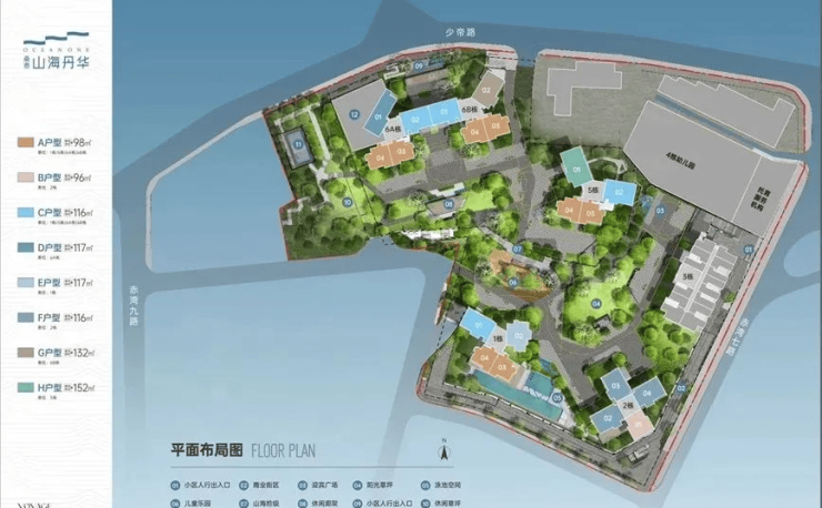 二期即山海丹华府,由5栋29-32F高的住宅组成,其中1/2栋商品房29F,3栋回迁房32F,5栋/6栋A/B座商品房31F,4栋是1所6班制幼儿园。总规划983套,其中可售商品房412户,全部2梯4户,回迁房571户,集中分布在3栋,另外1/5栋有部分回迁房。