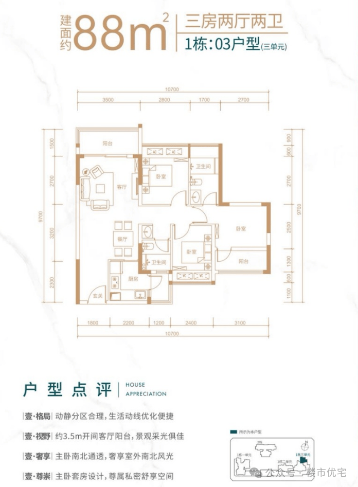 1栋三单元03号房,北向户型,动静分区布局,客厅开间3.5米带有1.5米进深阳台,主卧通透开间进深比良好,空间利用较为充分,南北双次卧,空间较为紧凑。居住空间通风效果较好,拥有良好的视野。