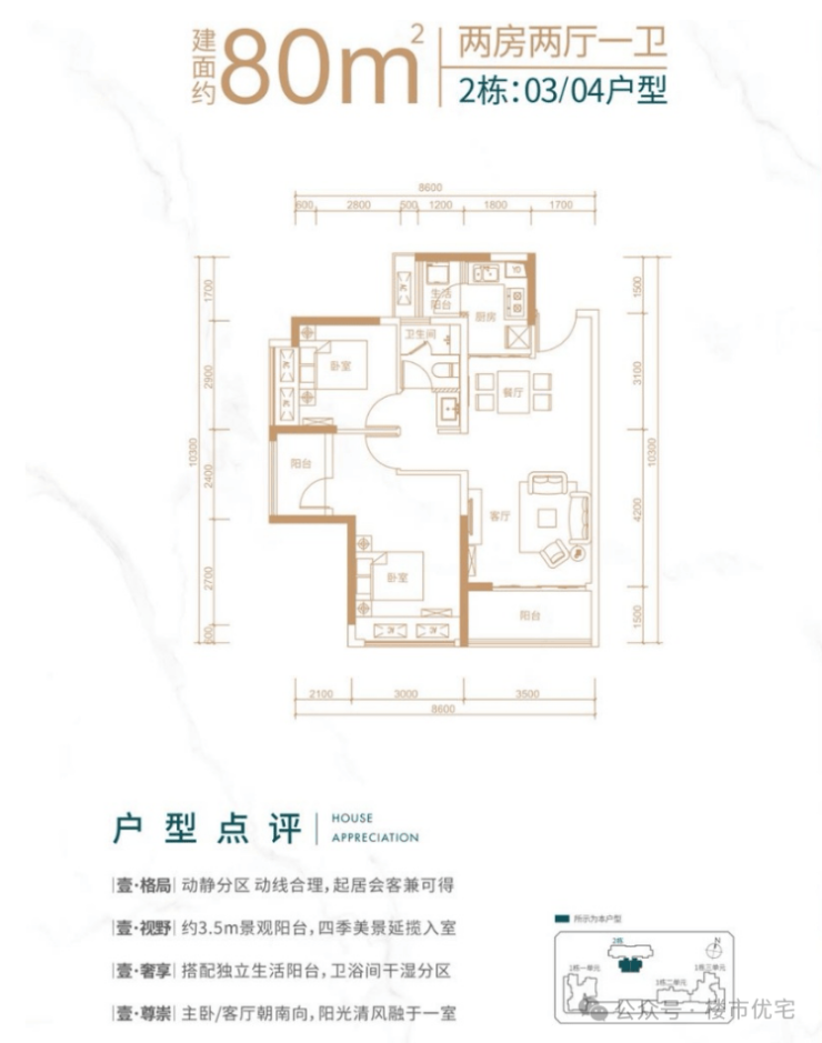 客厅朝南带阳台,主卧朝南,次卧朝西 该户型分布在2栋03,04号房