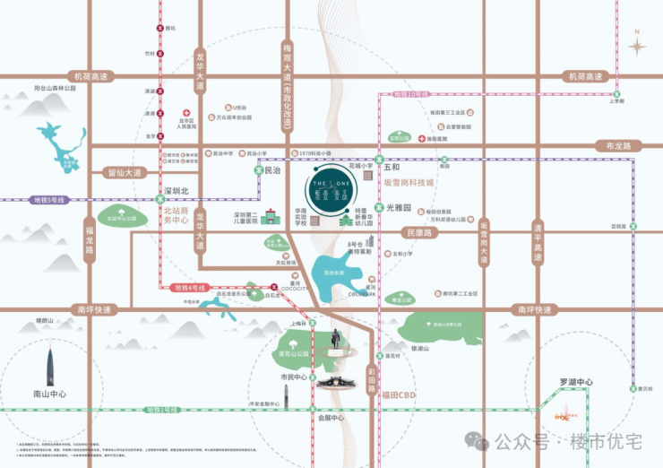 项目位于深圳中轴北段,地处深圳北站商务中心、坂雪岗科技城、福田CBD三大中心交汇处,教育、文化、生态、商业、娱乐休闲等多元价值荟萃,远见美好未来。