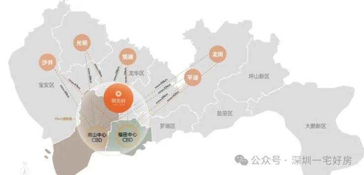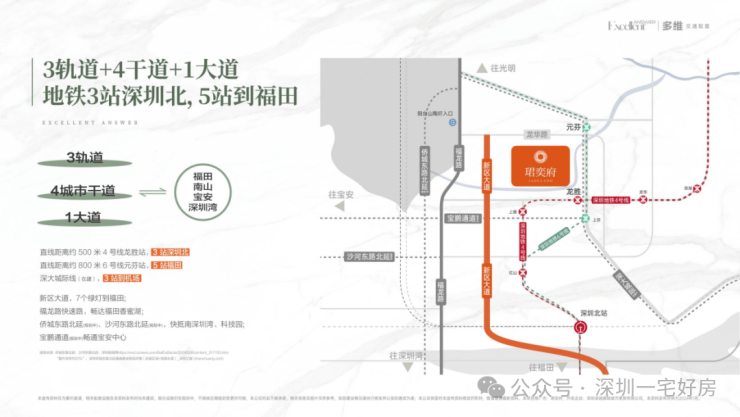 项目周边环绕"五纵四横"多维路网,包括新区大道、福龙路快速路、侨城东路北延(在建中)、沙河东路北延(规划中)和宝鹏通道(规划中) ,自驾出行可快速抵达福田、南山等核心区域,通勤效率提升约20% 。其中,新区大道可7个红绿灯直达福田,福龙路快速路则能迅速连接南山、深圳湾和科技园,宝鹏通道则为前往宝安中心提供了便捷通道 。