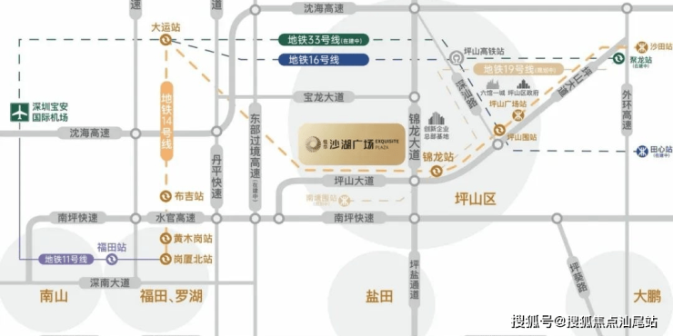 地铁:紧邻地铁14快线坪山门户站——锦龙站(约600米),12站福田岗厦北。周边临近地铁16号线(14号线一站直达坪山围站换乘)、地铁19号线(规划中)、地铁33号线(在建)。