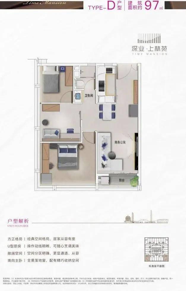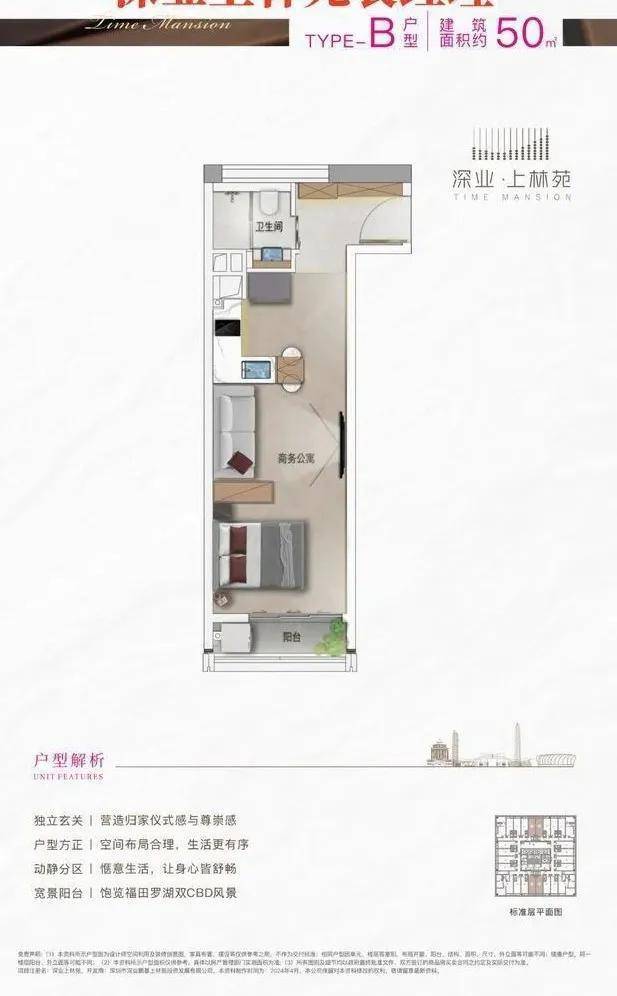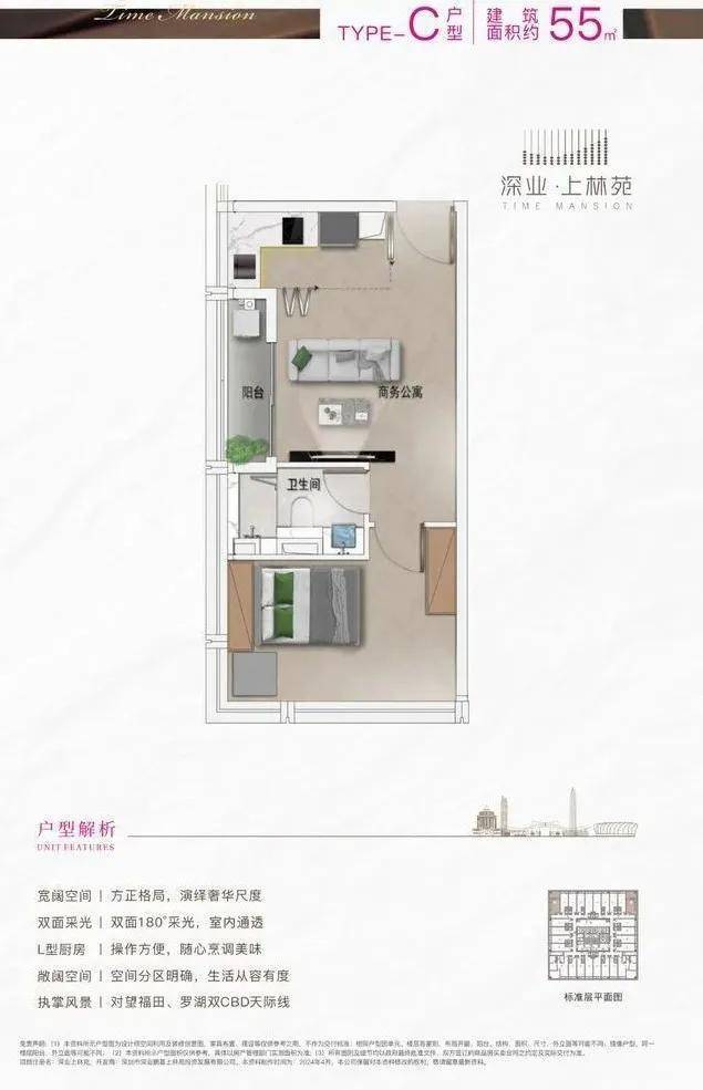 深业上林苑主推建面约40~97平方米的1~3房公寓,约八成为40~50平方米的小面积户型,适合年轻人居住或工作,以及伴读家庭等。户型设计现代简约,实用率高,且户户配有阳台。装修方面,采用一线品牌材料,如入户门、橱柜、电梯等,品质有保障。公寓为带装修交付,购房者无需担心装修问题。