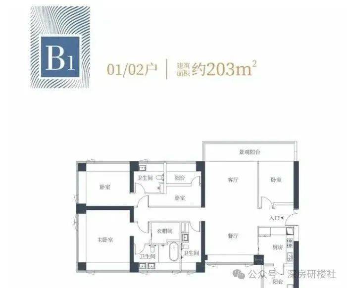 B1户型约203平方米,3+1房两卫,竖厅双龙抱珠格局,东北朝向,阳台连通次卧,视野景观较好,但临近地块规划可能对其产生一定影响。