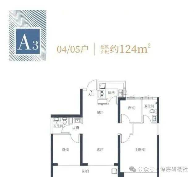A3户型约124平方米,三房两卫,双龙抱珠格局,东南朝向,客厅开间约4米,约7米阳台连接次卧,但公卫同样为暗卫,且卫生间对着消防天桥,隐私性欠佳。