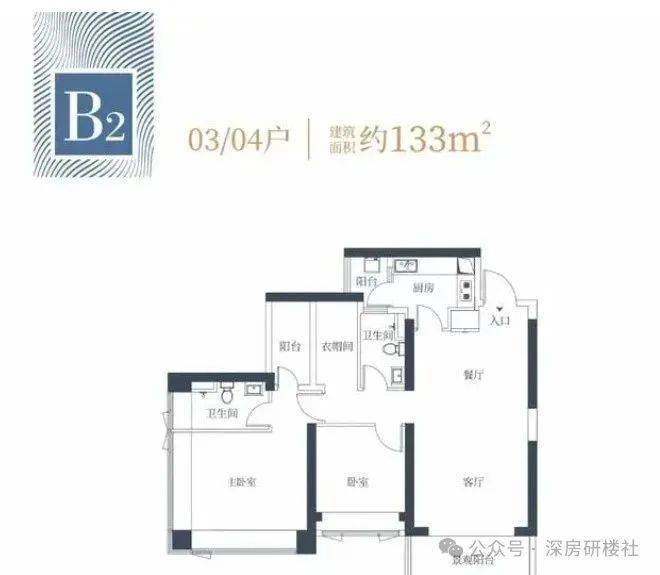 B2户型约133平方米,2+1房两卫,经典竖厅格局,西南朝向,可欣赏到伶仃洋海景,但视野受周边规划影响较大。