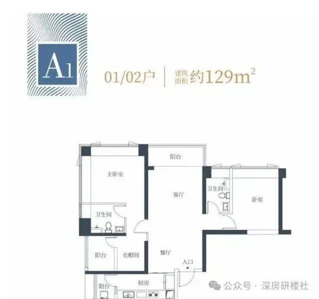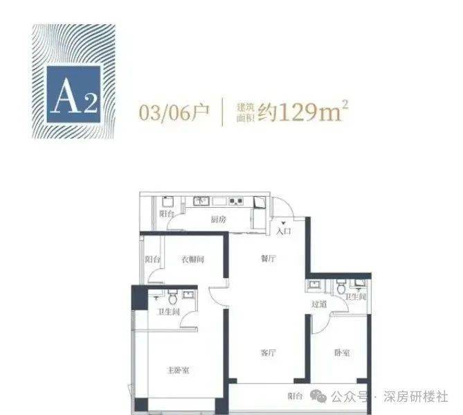A2户型同样约129平方米,2+1房两卫,竖厅格局,东南朝向,阳台更大,连通次卧,但公卫为暗卫,空气流通性稍差。