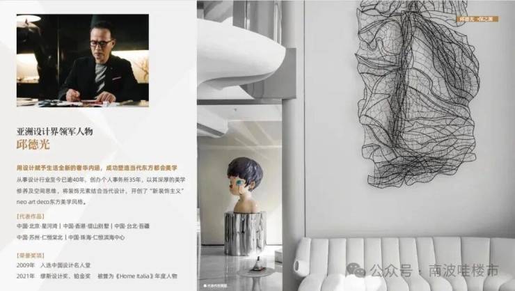 亚洲设计界领军人物邱德光,从事设计行业至今已逾40年,以其深厚的美学修养及空间思维,将装饰元素结合当代设计,开创了“新装饰主义”neo art deco东方美学风格,曾执笔北京星河湾、香港缇山别墅、台北吾疆等豪宅项目的设计。