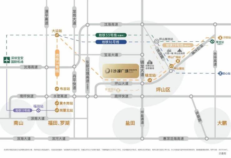 佳华沙湖广场占位坪山门户位置,距离14号线首站锦龙站约600米,极速通达全城;同时连接坪山大道和锦龙大道双头牌,位处坪山入口,通过坪山大道、锦龙大道链接坪盐通道、东部过境等高快速路等出行方式,让你轻松快捷往返深港中心。