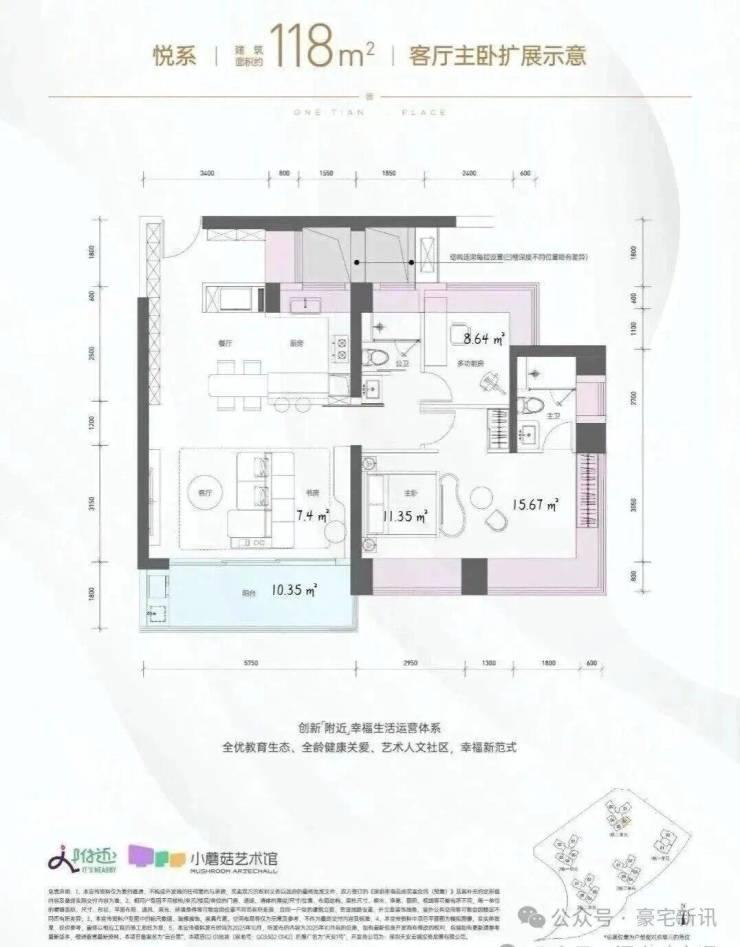 118㎡的4房2厅2卫,1栋2单元03/04户型+2栋1/2/3单元03.04.05户型,设计的是竖厅格局,进门约6.12平的入户玄关位,客厅3.5米开间,LDKB一体化设计,四开间朝南,动静分区,分别做到了主卧15.67㎡/次卧11.35㎡/次卧8.46㎡/次卧7.4㎡(包含墙体飘窗),客厅连接次卧出5.75米长的大阳台约10.35平,U型厨房,卫生间干湿分离,得房率约96.5%(包含赠送),西南或东南朝向。飘窗赠送面积14.31㎡+阳台赠送面积5.17㎡=实际赠送19.48㎡。