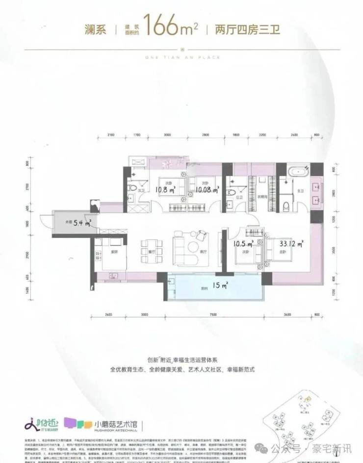 166㎡的4房2厅3卫,1栋2单元01户型,设计的是横厅南北通透格局,独门独户,赠送约5.4平的入户空间,客餐厅7.5米开间,LDKB一体化设计,五开间朝南,主卧带大衣帽间,双套间设计,分别做到了主卧33.12㎡/次卧10.8㎡/次卧10.5㎡/次卧10.08㎡(包含墙体飘窗),客厅连接次卧出7.5米长的大阳台约15平,U型厨房,卫生间干湿分离,得房率约100.24%(包含赠送),西南或东南朝向。飘窗赠送面积20.7㎡+阳台赠送7.5㎡+外廊赠送5.4㎡=实际赠送33.6㎡。