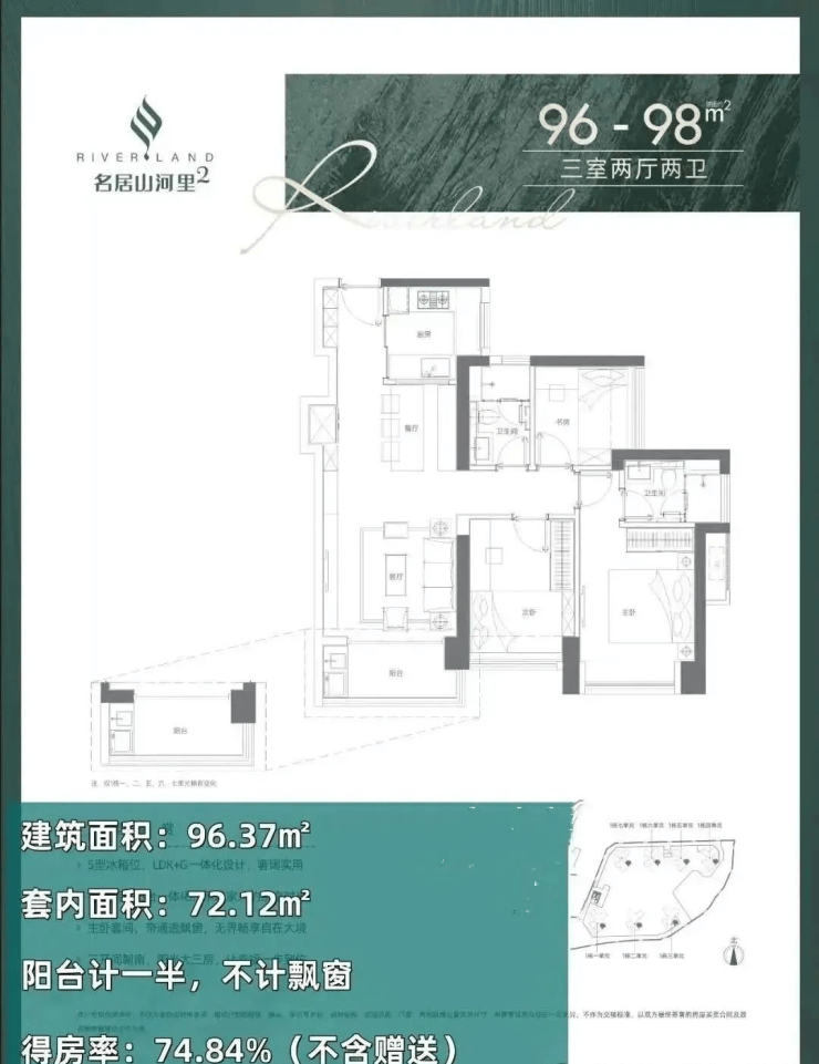 96-98㎡的3房2厅2卫(05户型),设计的是经典竖厅格局,餐客厅一体化,客厅3.5米开间,S墙设计预留冰箱位,三开间朝南,U型厨房,得房率:74.84%(不含赠送),阳台1.5米进深,东南朝向。
