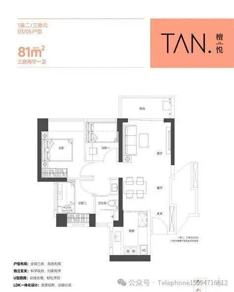 81㎡的3房2厅1卫,设计的是竖厅格局,LKDB一体化设计,进门入户玄关,有1个次卧做的双飘窗,U型厨房,卫生间三段式分离,