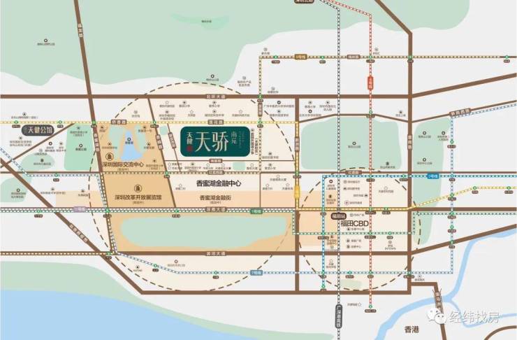 天健天骄项目位于景田,但与西侧香蜜湖豪宅区仅有两三百米的距离,可共享豪宅区的生态配套。