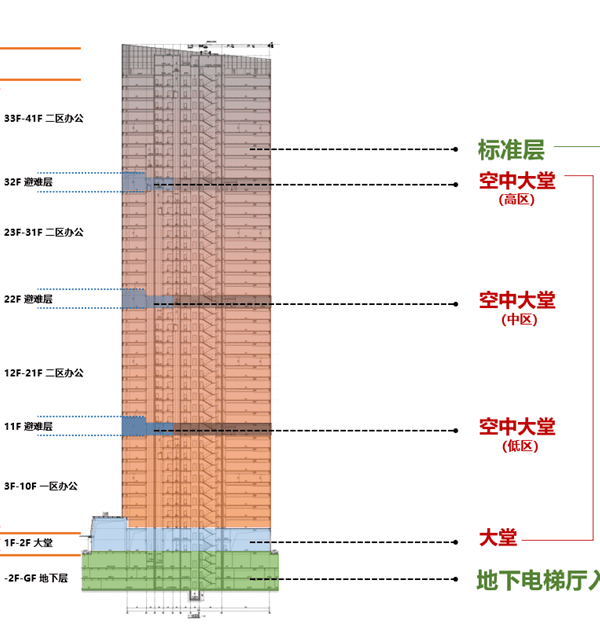 11/22/32楼5米空中大堂,围绕文化创新、科技共享、绿色生态三主题设计,打造企业的第二功能厅。