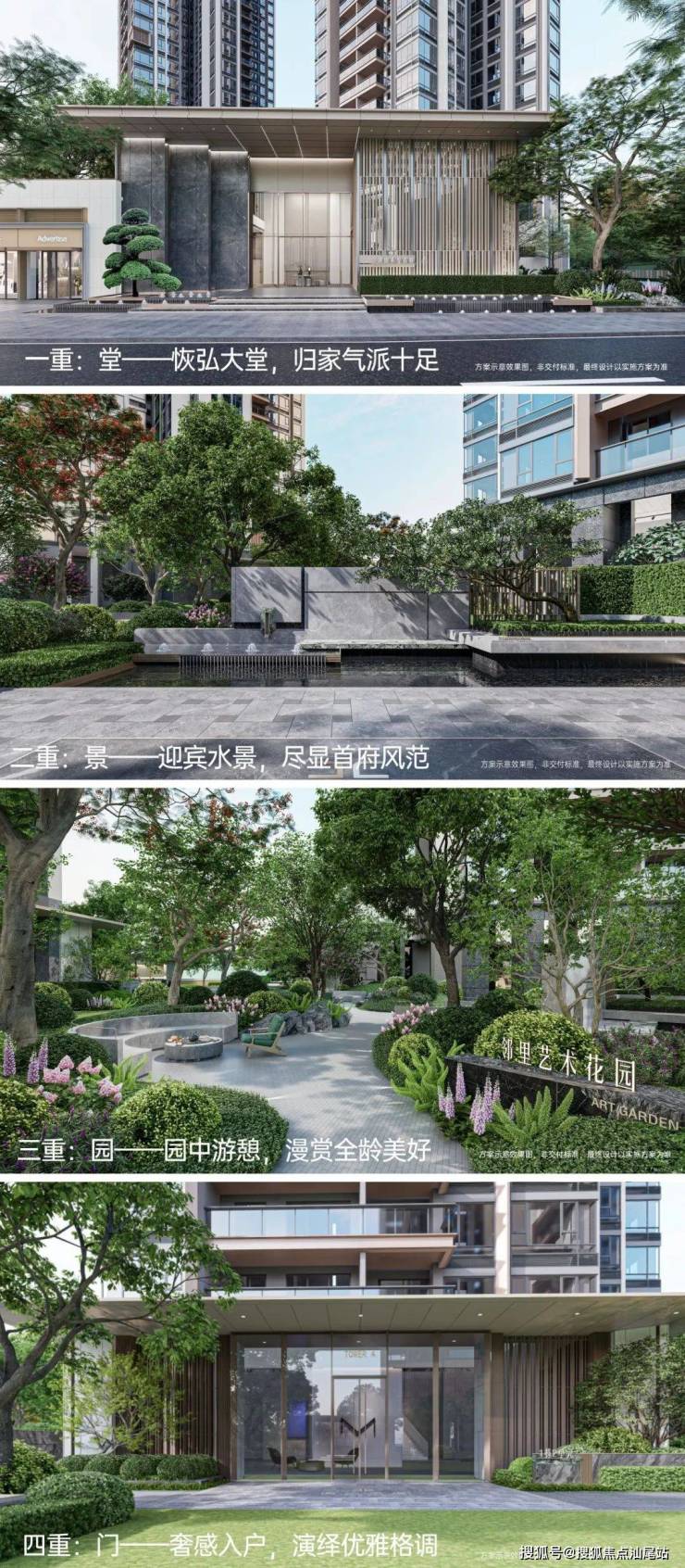 【超配礼序·四重归家】匠造四重归家礼序,从“恢弘大堂—迎宾水景—邻里艺术花园—奢感入户”定制沉浸式归家。