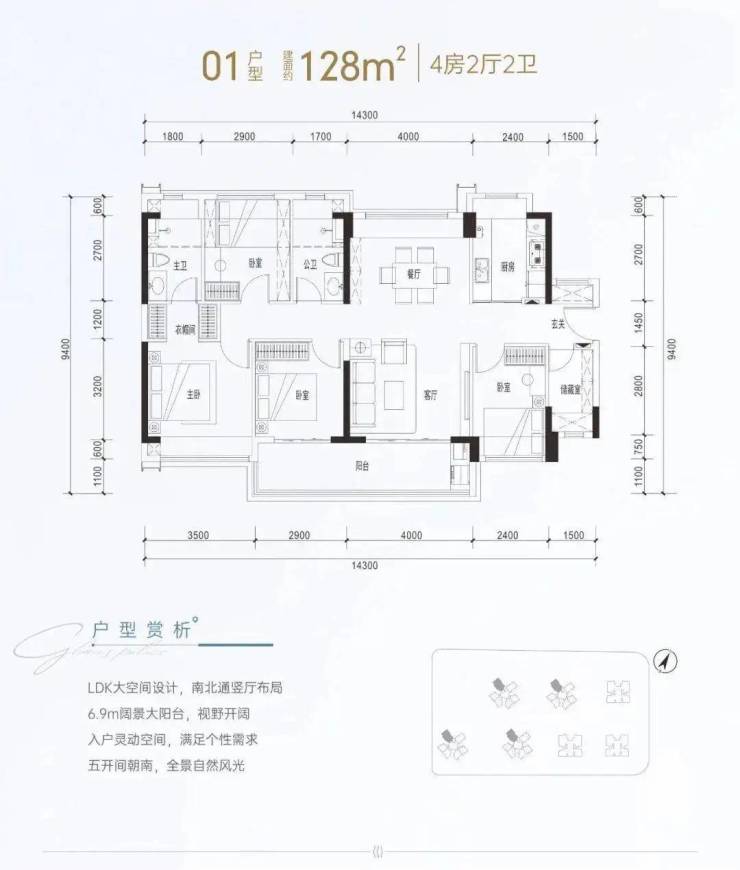 建面约128㎡属于南北通透竖厅格局,客厅进深7.1米(不含阳台),开间4米,配有6.96米宽景阳台,主卧套间设计,配有衣帽间和三段式卫生间。这个户型除通透性比传统横厅更优异外,静区部分的静溢性也会比较好,居住舒适性更佳,受众也是老少皆宜。