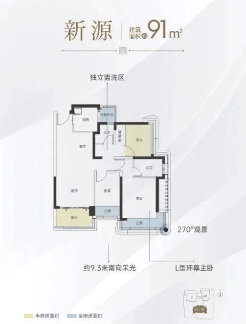 91㎡三房两厅两卫:南向设计,摩天轮景观尽收眼底,共有50套。