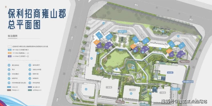 保利招商雍山郡,由保利+招商集团2大央企开发,总占地面积约2.5万㎡,总建筑面积约18.3万㎡,计容建筑面积约13.5万㎡,容积率5.4,绿化率35%,共由5栋46-48F的超高层住宅组成,其中1栋A/B/C座商品房46F,1栋D座安居房48F,1栋全年自持租赁住房46F,2栋是1所幼儿园。