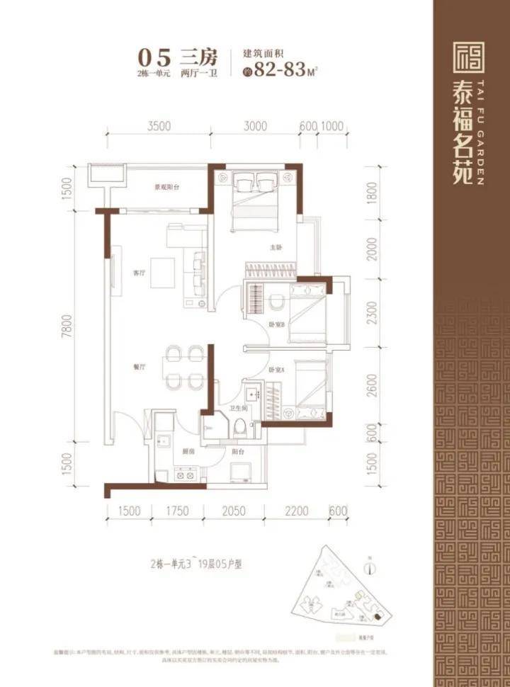 建面约82-83㎡的3房2厅1卫户型,在保证空间尺度感的前提下做到3个房间,实用性高