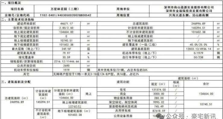 万星林花园项目位于前海合作区南山街道兴海大道东侧,沿山路南侧,宗地号T102-0401。根据本项目《深圳市国有建设用地使用权出让合同》及《建设用地规划许可证》,项目总用地面积53819.80平方米,用地性质为二类居住用地;计规定总建筑面积139654平方米,其中住宅131374平方米、商业3000平方米、幼儿园5000平方米(独立占地面积5400平方米,18班)、物业管理用房280平方米;规定容积率≤2.6;建筑一级覆盖率≤40%,二级覆盖率≤25%;建筑高度限高80米;机动车泊位数1979辆;地块内需提供不少于2690平方米公共开放空间。