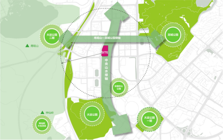 城建配套方面:邻近建面超29万㎡大运中心体育馆;直线距离约1km内大运公园、龙城公园环绕;直线距离约3.5km内龙岗区中医院、龙城医院、龙岗区妇幼保健院、龙岗区人民医院。