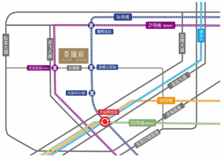 其中,大运枢纽作为东部唯一集城际、快线、普线于一体的交通枢纽,有3/14/16及33(在建中)号线交汇,未来可高效畅达深圳各区,并链接湾区各地。