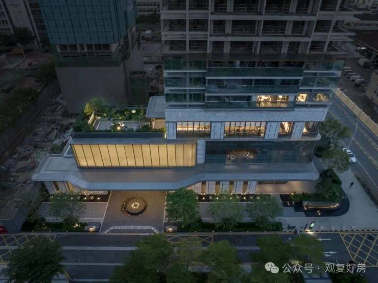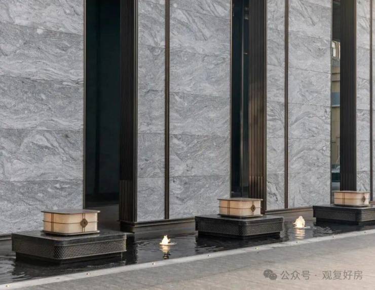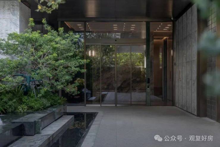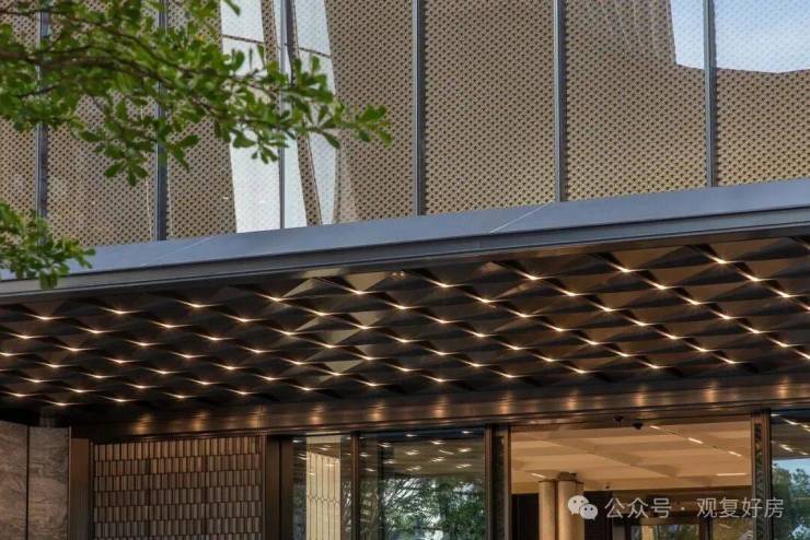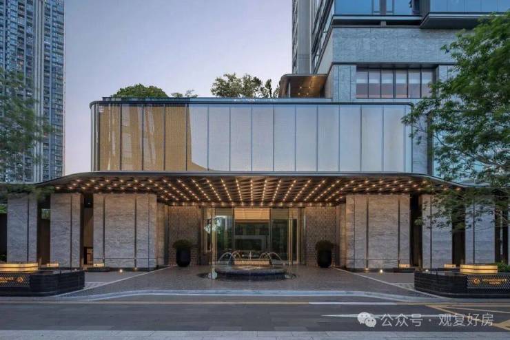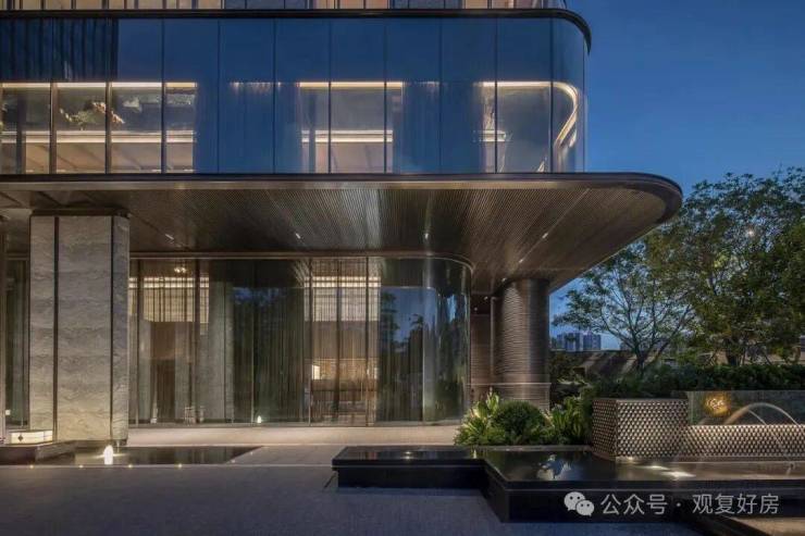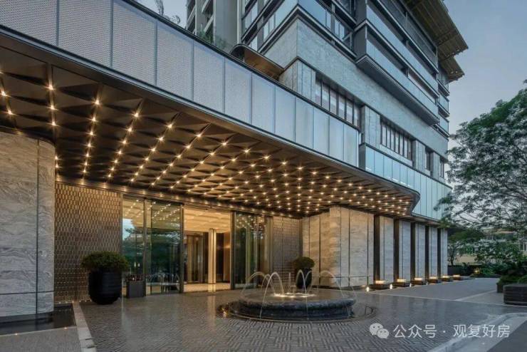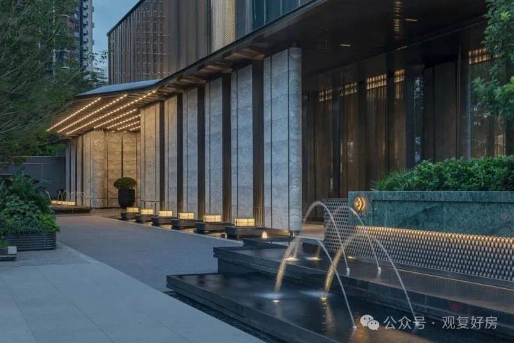 酒店式社区大堂:朝向广场,入口前场、门廊、大堂、内庭院、单元大堂组成的归家动线,配合建筑、景观、室内、标识、灯光一体化设计,汲取糅合后的南洋文化元素细节,把酒店式归家仪式感拉满,彰显非凡气度。