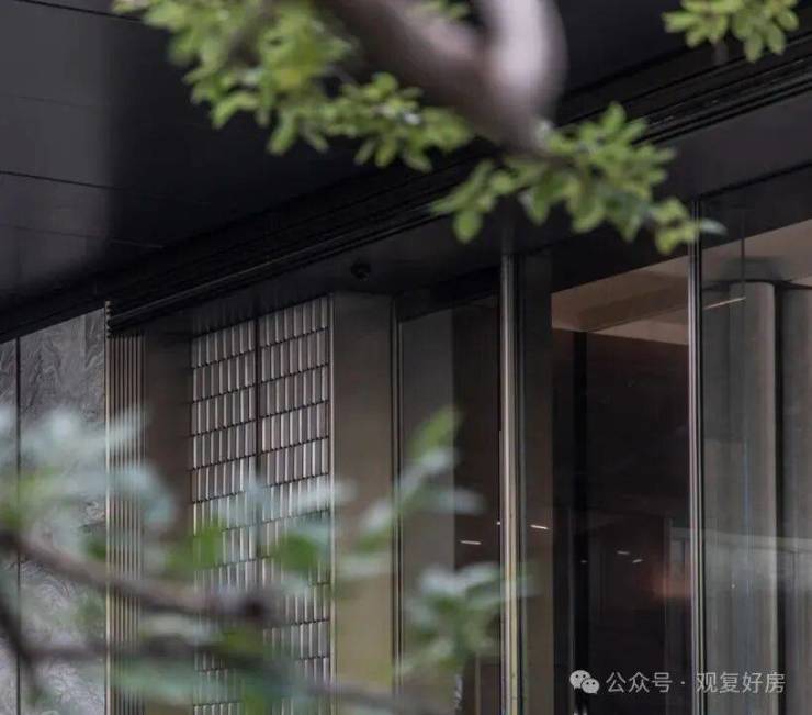 裙房部分近人尺度的造型强调出项目的品质与调性,所有材质与细节都做了精心雕琢与推敲。入口处二层玻璃体结合夜景灯光,白天可以很好地勾勒出晶莹剔透的形体,晚上灯光内透LOGO图案反射项目的文化内涵。