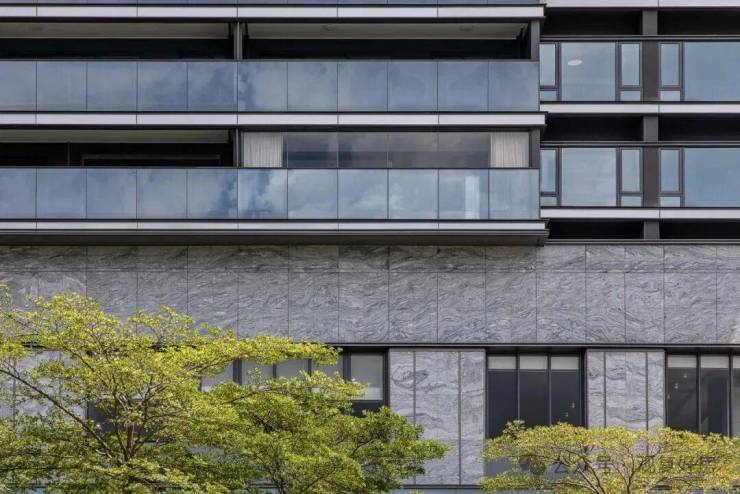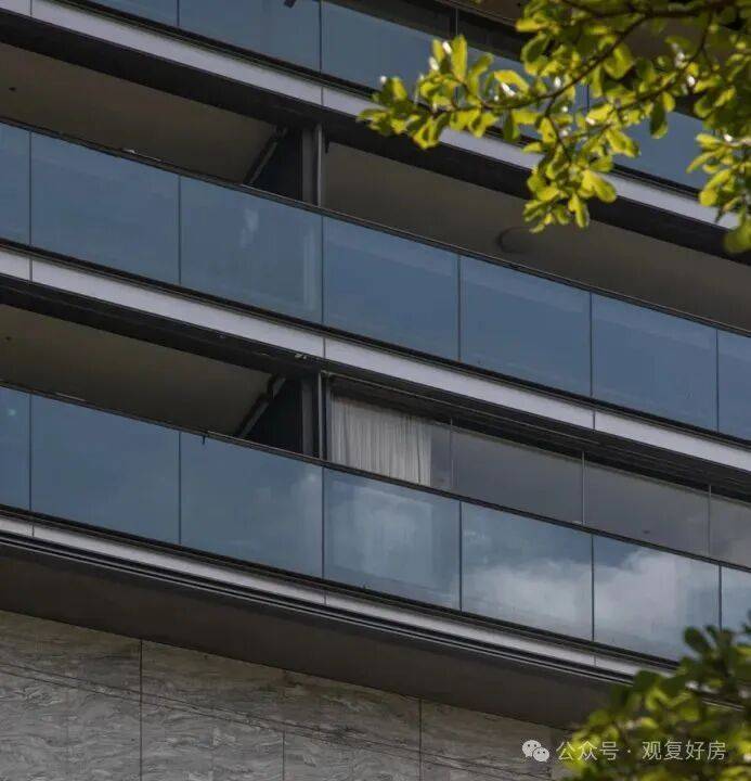 塔楼采用大面积的270°转角凸窗的形式,削弱建筑体量感,弱化建筑边际,形成与豪方天际办公楼相呼应的公建化立面效果。立面材料主要为玻璃加铝型材线条和真石漆,强调现代材料虚实结合。塔楼顶部设计了约5m高塔冠,采用夹胶彩釉玻璃,将项目专属LOGO符号编织图纹融入其中,形成视觉昭示形象。