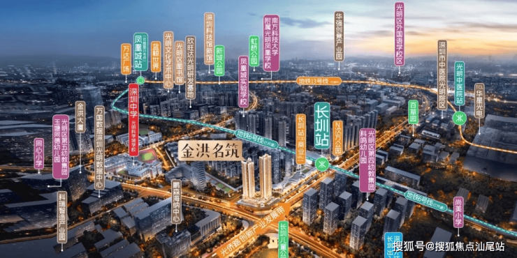 光明科学城,中国版“硅谷”、大湾区科技创新“主引擎”。凤凰城片区,将打造成光明中央商务区、总部经济聚集区、超级商圈所在地。金洪名筑占据凤凰城“一环两轴三核”发展格局中的“一轴一核”(光侨路——创新产业发展轴;轨道长圳站节点——光明门户之核芯)。周边云集金洪大厦、招商智慧城、TCL华星光电等十余个科技产业园区,释放磅礴产业红利。