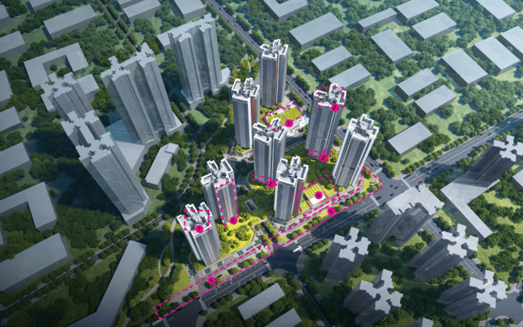 天健瑞云府,由天健集团+深福保+深高新集团3家国企联合打造,总占地面积约3.6万㎡,总建筑面积约22.49万㎡,计容建筑面积约16.46万㎡,容积率4.75,绿化率30%,共由8栋32-36层高住宅组成,分3个地块开发,不过花园都是共享连通在一起的,其中1栋1单元/2栋2单元/3栋1单元住宅33F,1栋2单元/2栋1单元/3栋2单元住宅32F,2栋3单元/2栋4单元住宅36层,4栋是1所9班制幼儿园。