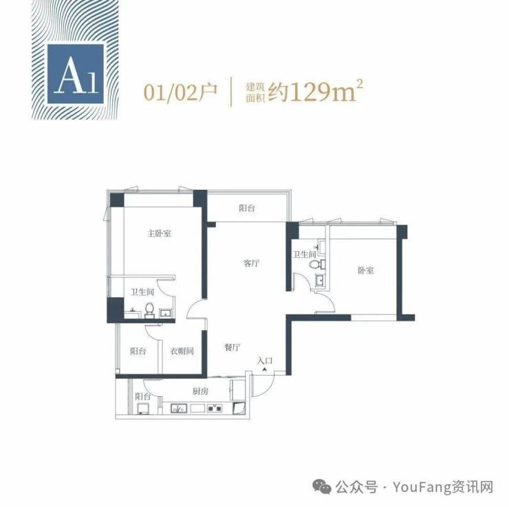 🔹1栋一单元A1、A2户型:面积约为129㎡;
