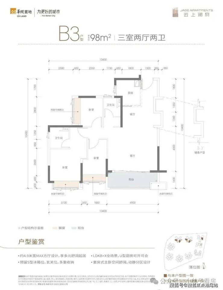 98㎡的3房2厅2卫,B3户型,设计的是MAX方厅,客厅4.9米开间,LDKB一体化+X全场景,S墙设计预留冰箱卡槽位,3个卧室分别做到了3.1米/2.8米/2.4米的宽度,U型厨房,公卫三段式分离设计,得房率83.95%(不含赠送),有西南或东南朝向。