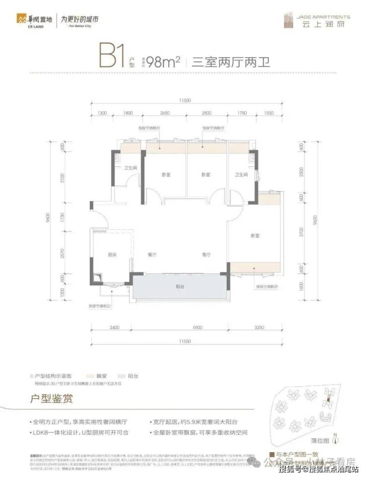 98㎡的3房2厅2卫,B1户型,设计的是横厅南北通透格局,客餐厅5.9米开间,LDKB一体化,3个卧室分别做到了3.25米/2.65米/2.5米的宽度,U型厨房,公卫三段式分离设计,得房率81.23%(不含赠送),阳台主朝东南向。