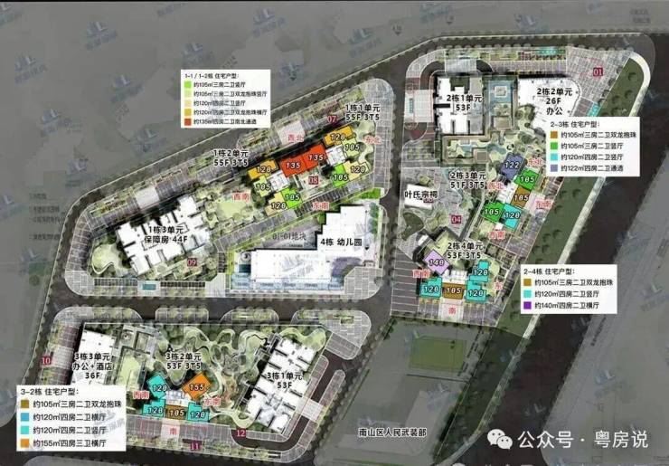 规划为3栋超高层塔楼住宅+幼儿园,1栋一、二单元193米55层,1栋三单元为保障房157米44层。