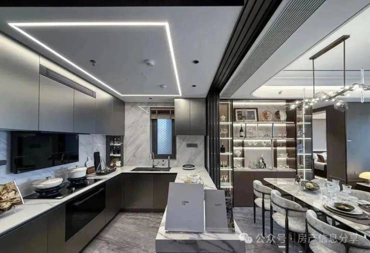 室内方面,进门的餐厨用了「深湾玖序」祖传同款的互动式可移动岛台,这种设计近年都比较火,平时亲友聚餐、做点心、包饺子等等的场景都可以贴合。
