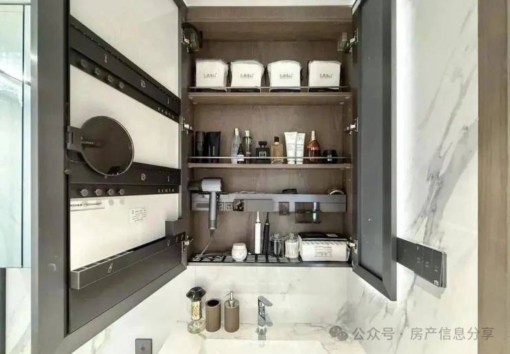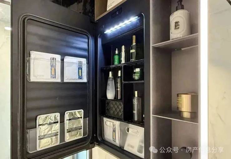 卫浴方面用了汉斯格雅、唯宝和杜拉维特,品牌定位也是相当凑合。另外主卫还配备了美妆冰箱,牙刷除菌的收纳柜。